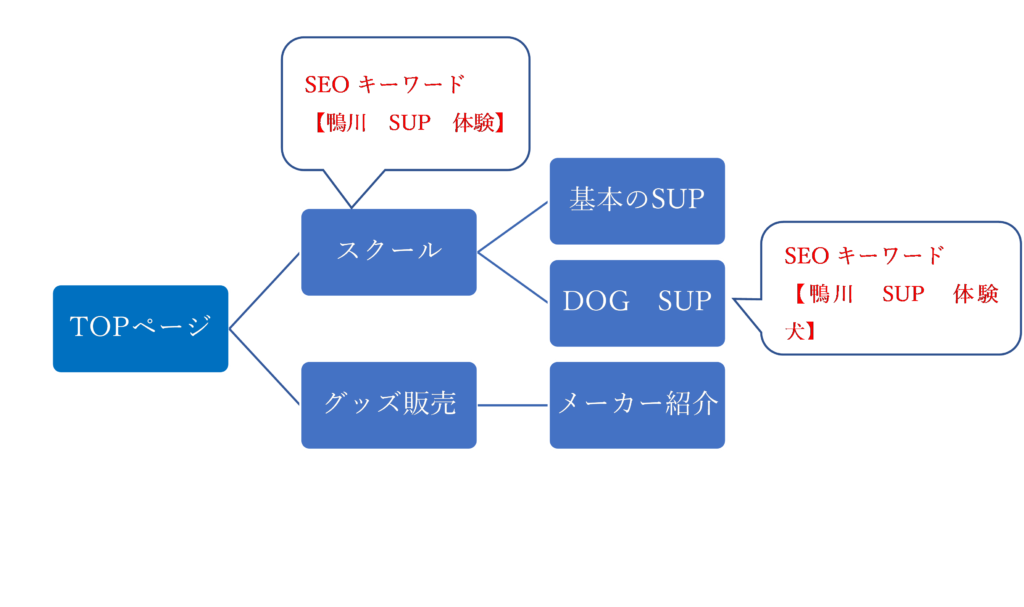 例えば、鴨川のSUPスクールのHPサイトで説明すると、SUP体験スクールのコンテンツとその中のDOG SUP体験コンテンツはSEOキーワードが変わるのが分かります。
